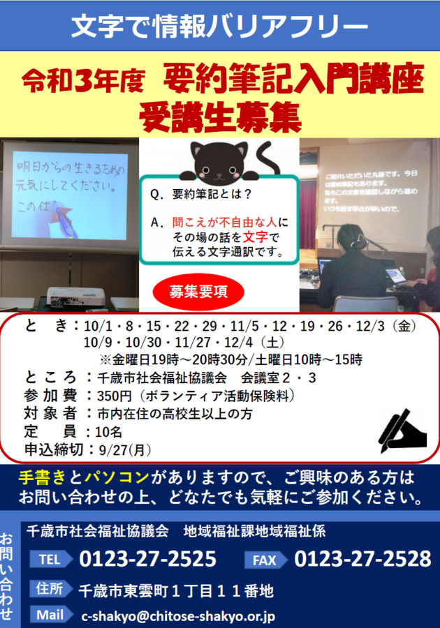 | 申込先 | 千歳市社会福祉協議会 地域福祉課地域福祉係 住所:千歳市東雲町1丁目11番地 電話:0123-27-2525/FAX:0123-27-2528 E-mail:c-shakyo@chitose-shakyo.or.jp |
