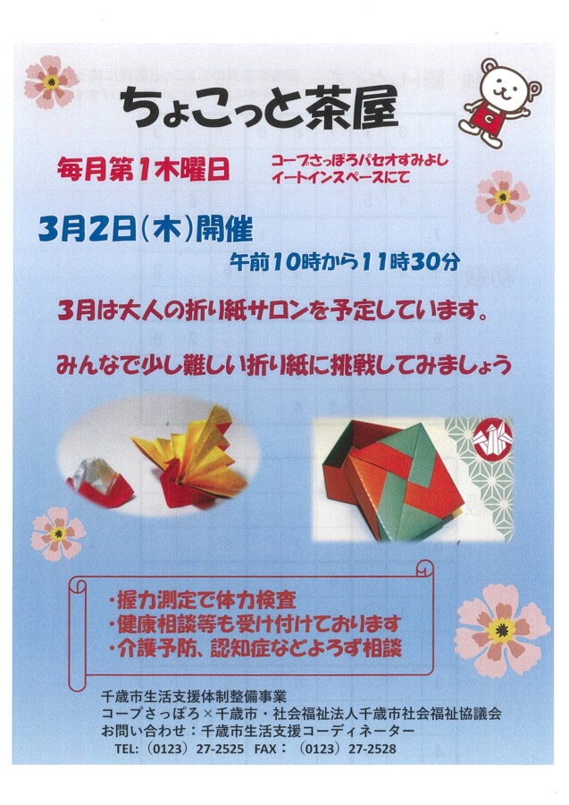 お買い物ついでにホッと一息 ☕ 地域の相談・交流の場 ちょこっと茶屋(12月~3月)のお知らせ🌈