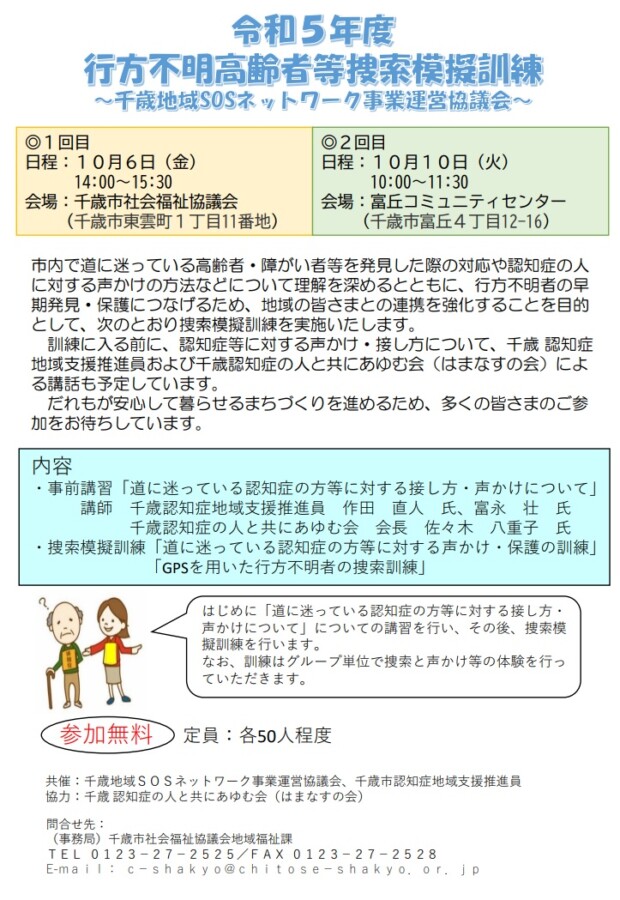 【千歳地域SOSネットワーク事業】令和7年度行方不明高齢者等捜索模擬訓練開催のお知らせ