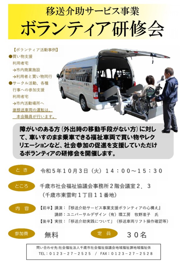 | 申込先 | 千歳市ボランティアセンター(千歳市社会福祉協議会 総務課ボランティア係) 千歳市東雲町1丁目11番地 千歳市社会福祉協議会事務所2階 TEL:0123‐27‐2525/FAX:0123‐27‐2528 |
