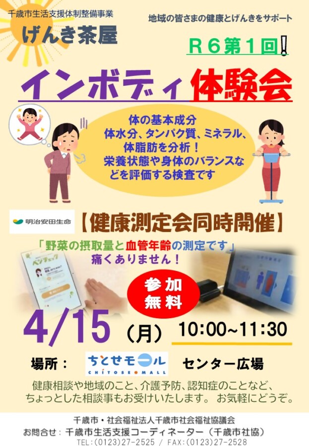 | 内容 | 【📅月替わりの楽しいイベントと相談コーナー】 毎月、皆さまの健康づくりや交流に役立つテーマでイベントを開催しています。 【12月】ハンドベルで癒しのひととき 🎼 ハンドベルで癒されませんか?😊 やさしく響くハンドベルの音色に耳を傾けながら、懐かしい風景画を眺めてみませんか。 音と絵が心をやさしくほぐし、穏やかなひとときをお届けします🎼 【1月】\あなたの体力は?/体力測定会実施!! 簡単な測定で、今のご自身の体力をチェックしみませんか?健康づくりのヒントが見つかるかもしれません👀 【2月】\よりよい睡眠のために🐑/健康セミナーと測定体験 ヤクルト「おなか元気教室」でよりよい睡眠のヒントを、明治安田生命による血管年齢・野菜の摂取量測定が体験できます。 【3月】手作り体験 🧵 ブレスレットづくり&折り紙で小物づくりなど、創作活動を楽しみます。 【常設相談コーナーのご案内】 イベント開催時間中は、下記の専門職による相談も随時受け付けています。 ○認知症、介護保険等 相談 千歳市認知症地域支援推進員や地域包括支援センター職員に、介護や認知症に関するお困りごと、健康に関することなどをご相談いただけます。 ○健康相談 健康上のお悩みなどをご相談いただけます。血圧・握力測定を行い、数値を記録して比較することも可能です。 |