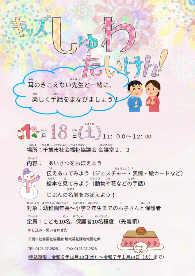 | 主催 | 千歳市社会福祉協議会地域福祉課地域福祉係 |
