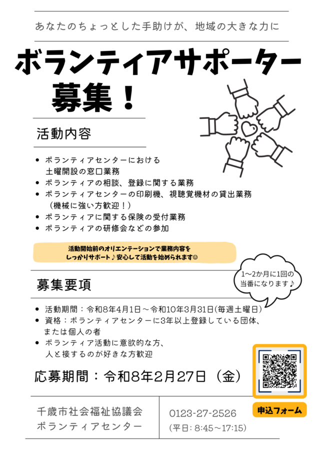 | お知らせ2026.01.07 | 令和8年度ボランティアサポーター募集のお知らせ |