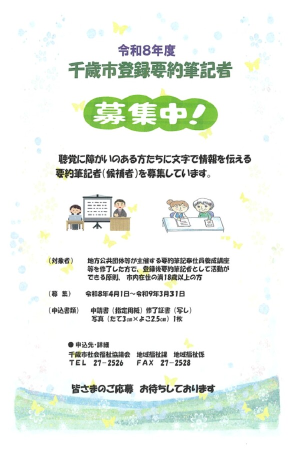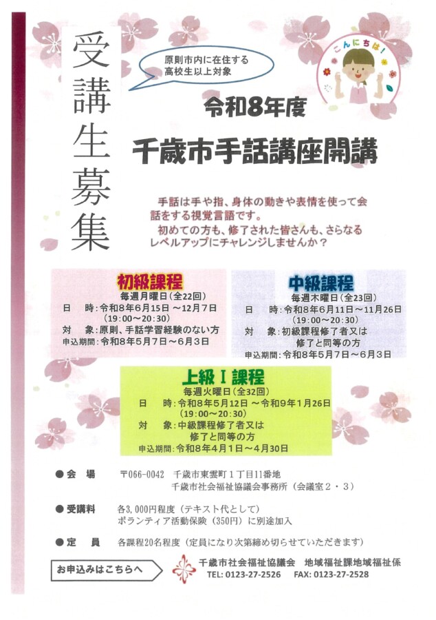 | お知らせ2026.04.10 | ✋令和8年度 千歳市手話講座受講生募集のご案内✋(初級・中級・上級課程) |