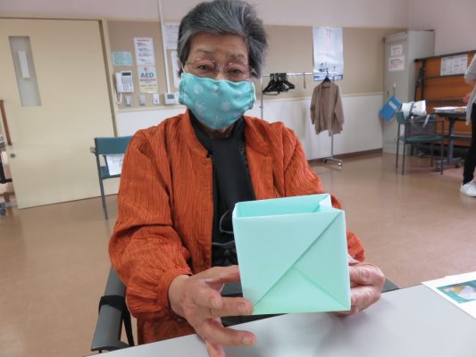 折り紙サロンで折り紙を教えてくださる久野さんも、「久しぶりで緊張する~」と言いながらのスタートでしたが、すぐにいつもの調子を取り戻し、楽しい雰囲気の中で時間を過ごすことができました。