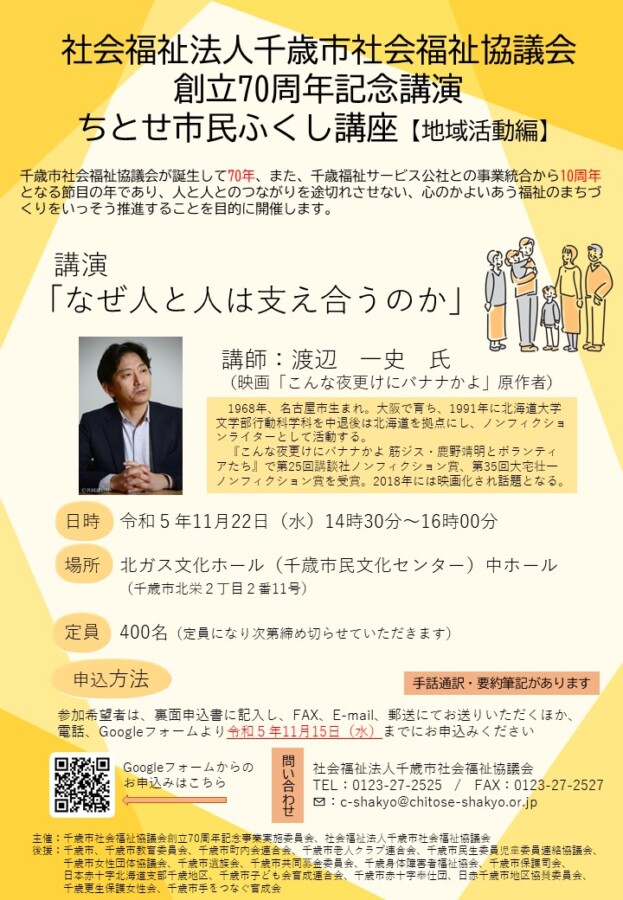 千歳市社会福祉協議会創立70周年記念講演・令和5年度ちとせ市民ふくし講座【地域活動編】を開催します
