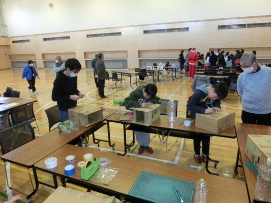 前半は、①木の小物づくり②アクセサリーづくり③ダンボール「カホン」づくりに分かれ作品