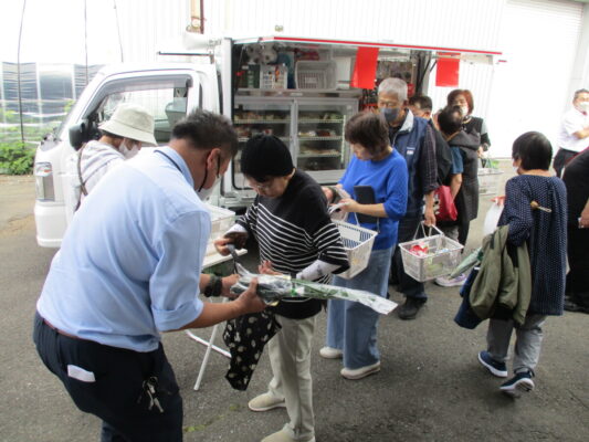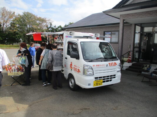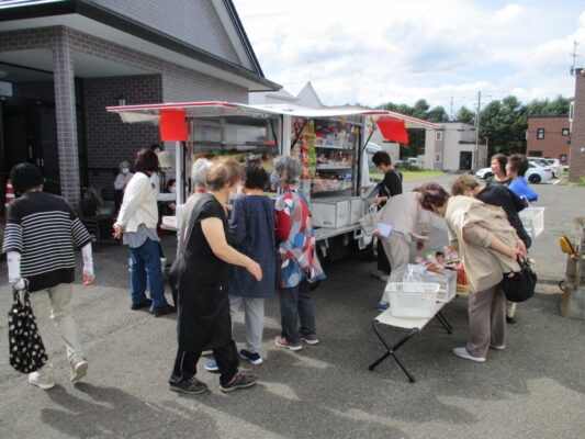 車の荷台には色とりどりの商品が並び、利用者の方々は店頭さながらに買い物を楽しんでいました。普段は遠くまで出かけられない方にとって、玄関先や施設前で気軽に必要なものを選べることは大きな安心につながります😊