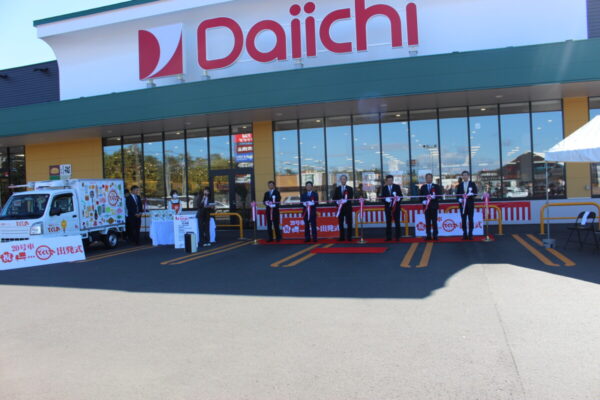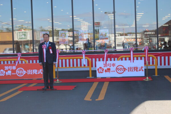 当日は、ダイイチ千歳店店舗前で出陣式が行われ、㈱ダイイチ代表取締役社長若園様、千歳市長横田様、本会の井上会長からの挨拶のあとテープカットが行われ、市内へと出発しました。