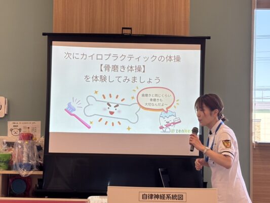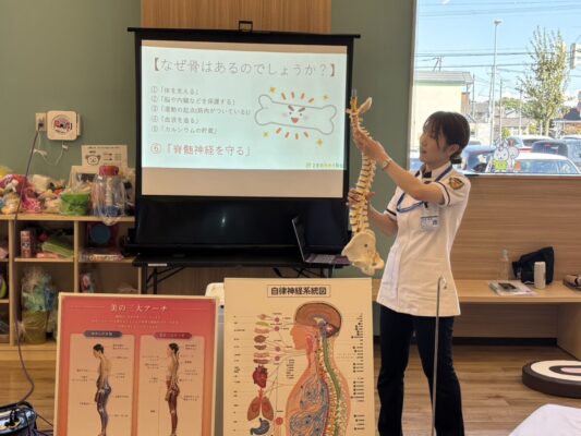 今月は、カイロプラクティックスクール「そらいろ」の加賀 摩莉さんを講師にお迎えして、「骨の役割」や「体の歪み」についてお話いただきました。