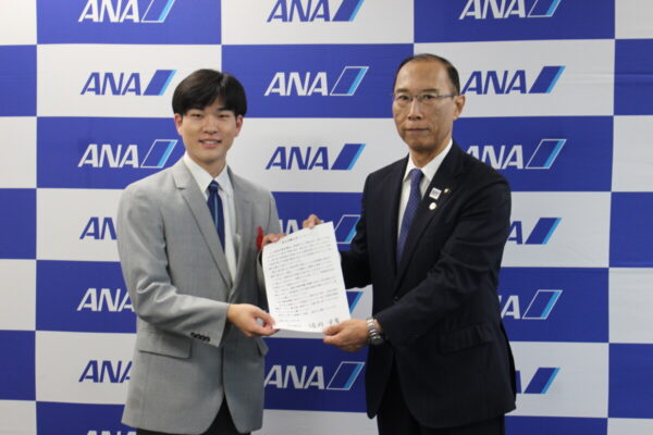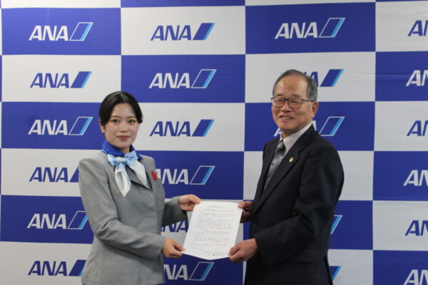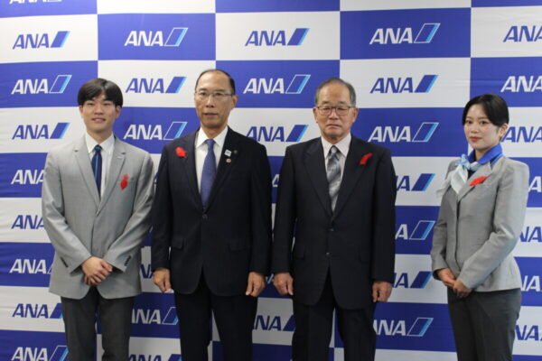 10月1日(木)、今年で79回を迎える共同募金運動の開始にあたり、全日本空輸株式会社(ANA)様のご協賛による「赤い羽根空の第一便」伝達式が新千歳空港で行われました。
