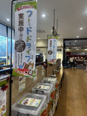 ダイイチ千歳店(北信濃867)では、地域課題解決や食品ロスの削減に貢献するため、千歳市内の「NPO法人もったいないわ・千歳」と連携して、フードドライブ回収箱をダイイチ店舗内に設置し、フードドライブ活動を始めました。