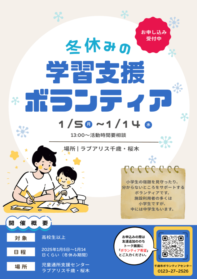 放課後児童デイサービスにて、通所する小学生の宿題を一緒に確認したり、つまずいている学習箇所を丁寧にサポートしていただくボランティアです。