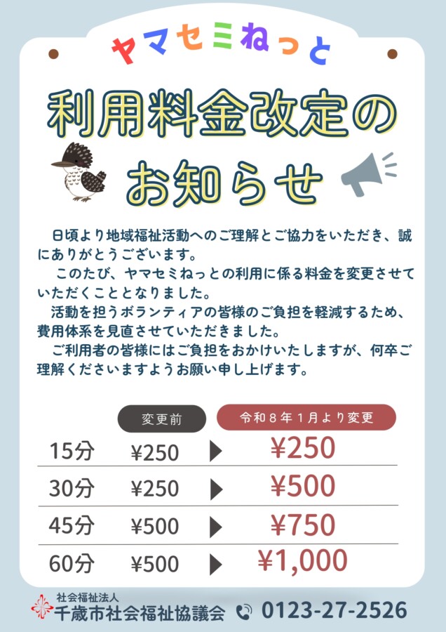 【料金改定のお知らせ】暮らしのちょっと応援サービス「ヤマセミねっと」