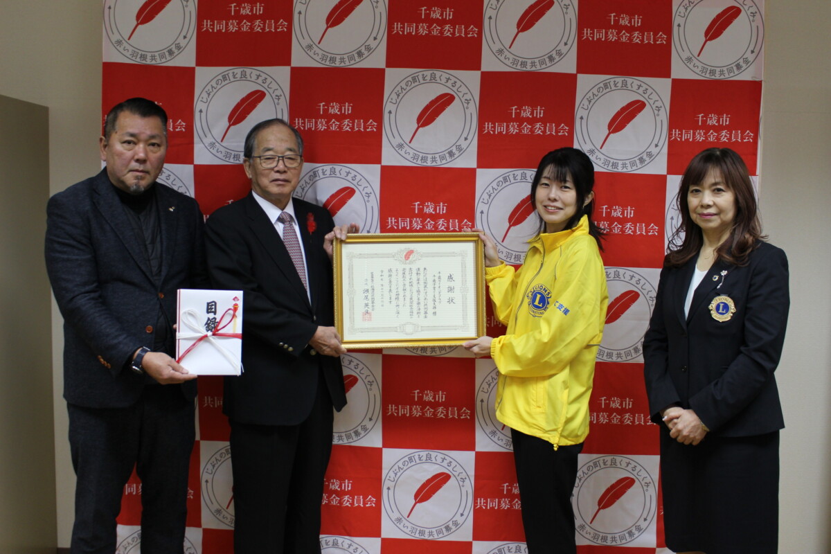 【共同募金】千歳ライオンズクラブ千歳子育て支援支部様より赤い羽根共同募金にご協力をいただきました 掲載日:2025.12.22 千歳中央ライオンズクラブ様より歳末たすけあい募金へ寄付があり、千歳市共同募金委員会の九谷田旭(くたにだあきら)会長が受け取りました。 今回で4回目、累計金額250,000円です。 いただきました募金は、千歳市が住みよいまちになるよう地域福祉活動に役立てられます。 ご協力ありがとうございました。募金額200,000円