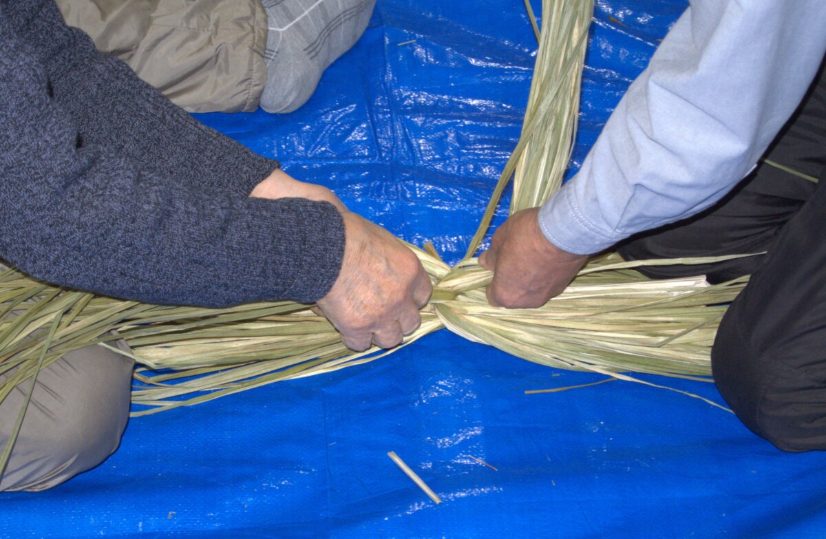 - ②の縄にもう一つの束をねじりながら巻き付け、1本の縄が完成です。