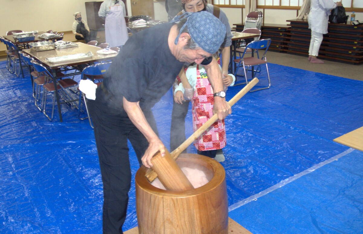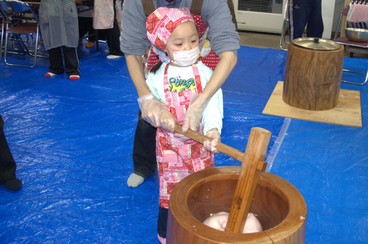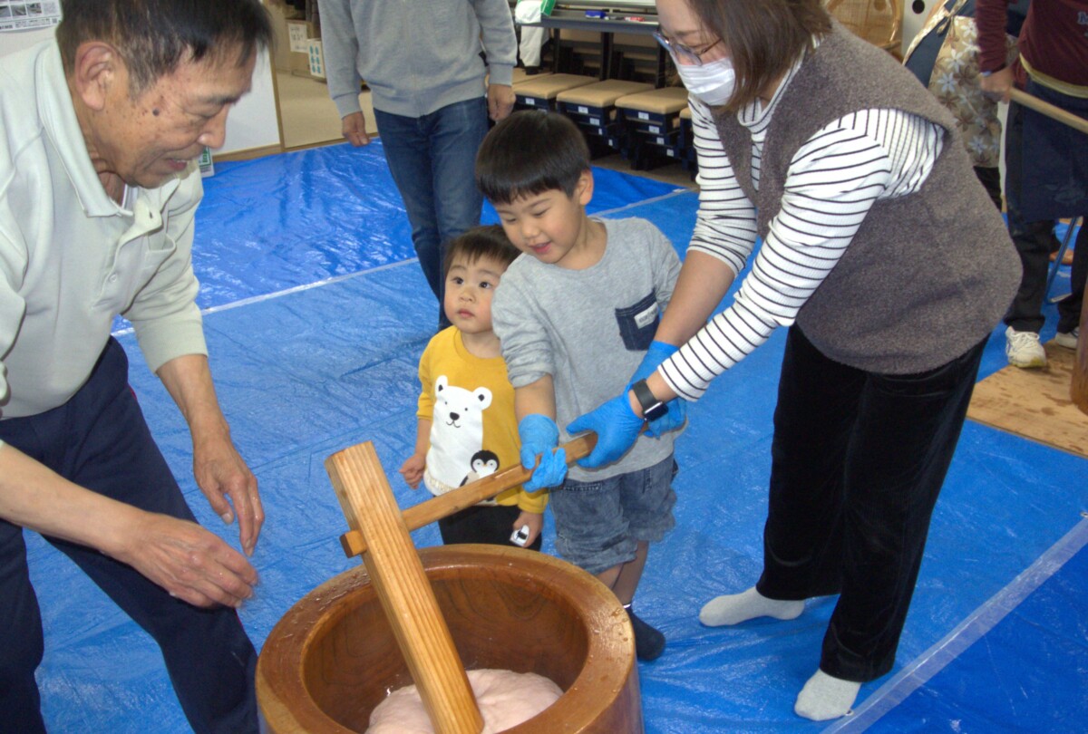 大人たちがつき終えた後は、子供たちも体験です。大人の手助けで杵でついていました。