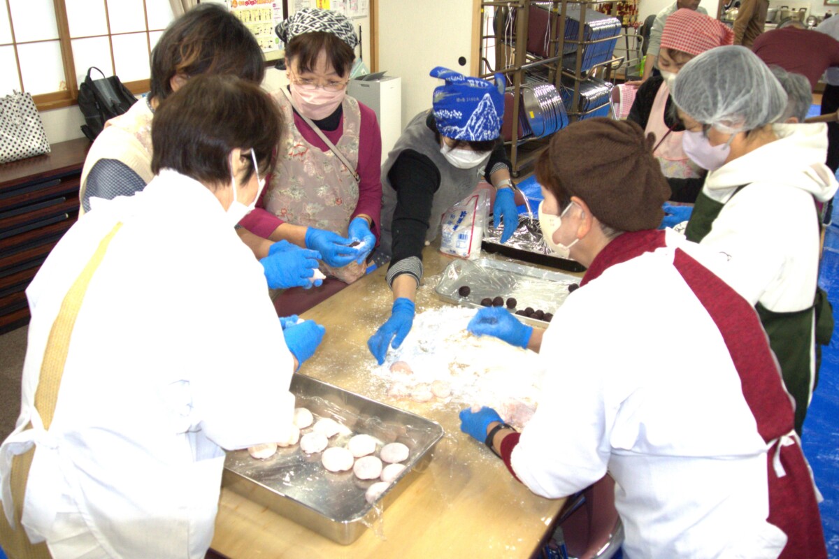 つき終えた餅は、紅白のあんこ餅にしていきます。手慣れた作業でたくさんの紅白餅が
