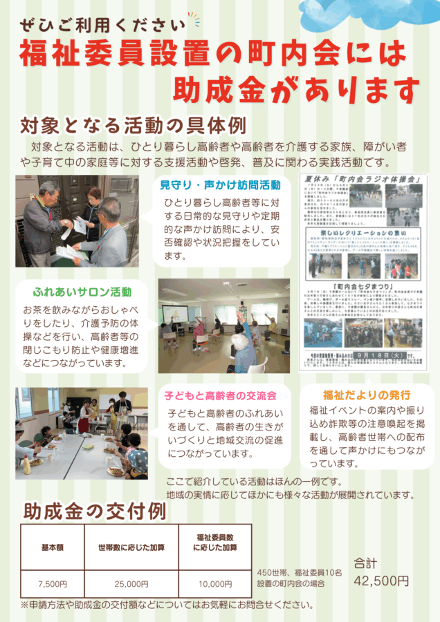 福祉委員を配置し、誰もが安心して暮らせる地域づくりを目的に「小地域福祉ネットワーク活動」に取り組む町内会へ助成金を交付します。