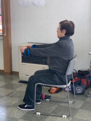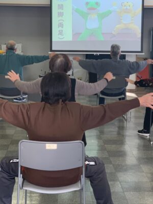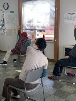いきいき百歳体操は、背筋を伸ばす体操や足の筋力をつける運動を行い、楽しく無理なく効果的に筋力アップを目指す体操です🎵 水分補給しながら、椅子に座り体操を行いました。