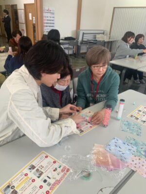 難しいところは、学生さん達に教えていただきながら、綺麗なビーズがキラキラ光る、自分だけの万華鏡をつくりました。参加者からは、「万華鏡懐かしいわ~学生時代に作った記憶があったよね」「あの時代楽しかったね~」など、昔懐かしむ場面もあり和やかに手づくりされていました。