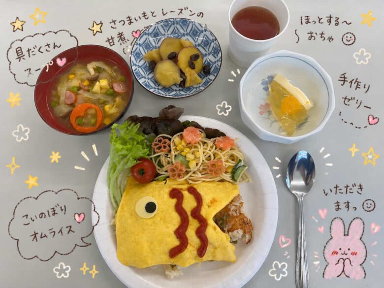 こいのぼりオムライスをメインに、副菜やスープ、デザートのゼリーとなんとも華やかです🎏✨