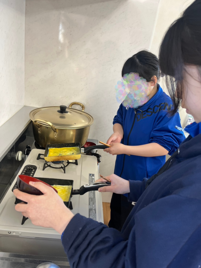 一人ひとり自分たちで卵を割り、溶きほぐして、焼く。