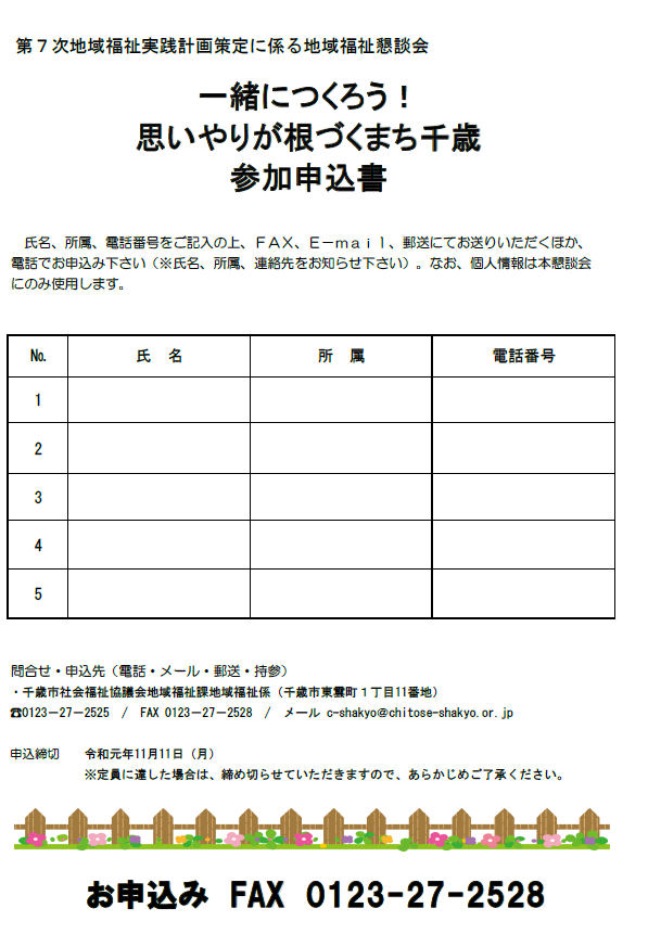 | 申込先 | 千歳市社会福祉協議会 地域福祉課地域福祉係 住所:千歳市東雲町1丁目11番地 電話:0123-27-2525/FAX:0123-27-2528 E-mail:c-shakyo@chitose-shakyo.or.jp |