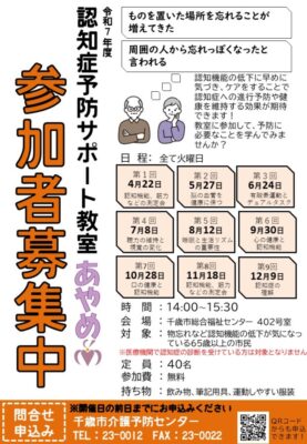 介護予防センターと北海道千歳リハビリテーション大学、千歳市認知症地域支援推進員が共同で、認知症予防に効果的な健康に関する講話やトレーニングなど全7回の教室を行います。内容や日程等の詳細については、当ホームページでお知らせいたします。
