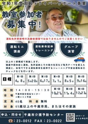 介護予防センターと北海道千歳リハビリテーション大学、千歳市認知症地域支援推進員が共同で、高齢ドライバーの方を対象に運転に必要な健康に関する講話やトレーニングを行う教室を4月~12月の期間月1回開催しています。日程等の詳細については、介護予防センター(TEL0123-23-0012)にお問い合わせください。